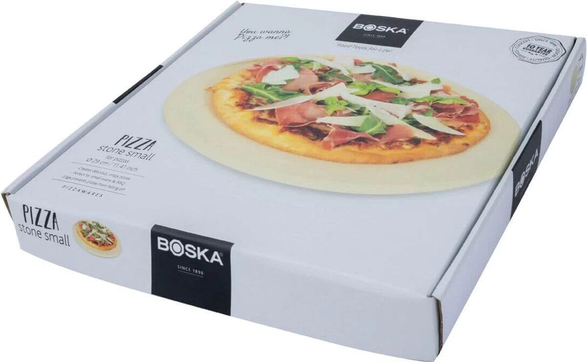Deze pizzasteen is extra dik. Dit maakt hem geschikt voor gebruik op de barbecue of in de oven. De opstaande rand aan de achterkant voorkomt dat je pizzaβs per ongeluk van de steen af schuift. De pizzasteen mag nooit in de vaatwasser. Was hem ook niet met de hand af; de steen absorbeert water, waardoor hij bij een volgend gebruik kan breken. Je maakt de steen eenvoudig schoon door er een droge keukendoek overheen te halen. Achtergebleven pizzaresten verwijder je met een hard plastic of houten spatel. Je krijgt standaard 10 jaar garantie op de BOSKA Pizzasteen Deluxe.