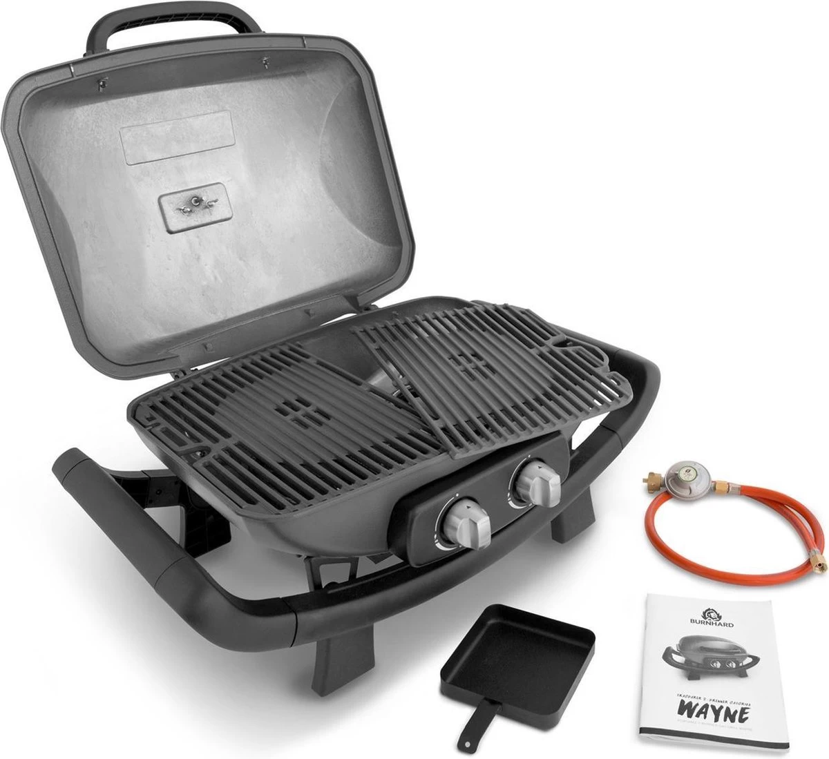 Barbecue er rustig op los tot maximaal 300 Β°CWAYNE grilt vlees, vis en groente met in totaal 3,5 kW en temperaturen tot maximaal 300 Β°C goed gaar. Ontsteek hiervoor de beide roestvrij stalen branders met de piΓ«zo-ontsteking en controleer de 2 grillzones naar behoefte met de traploze regeling.