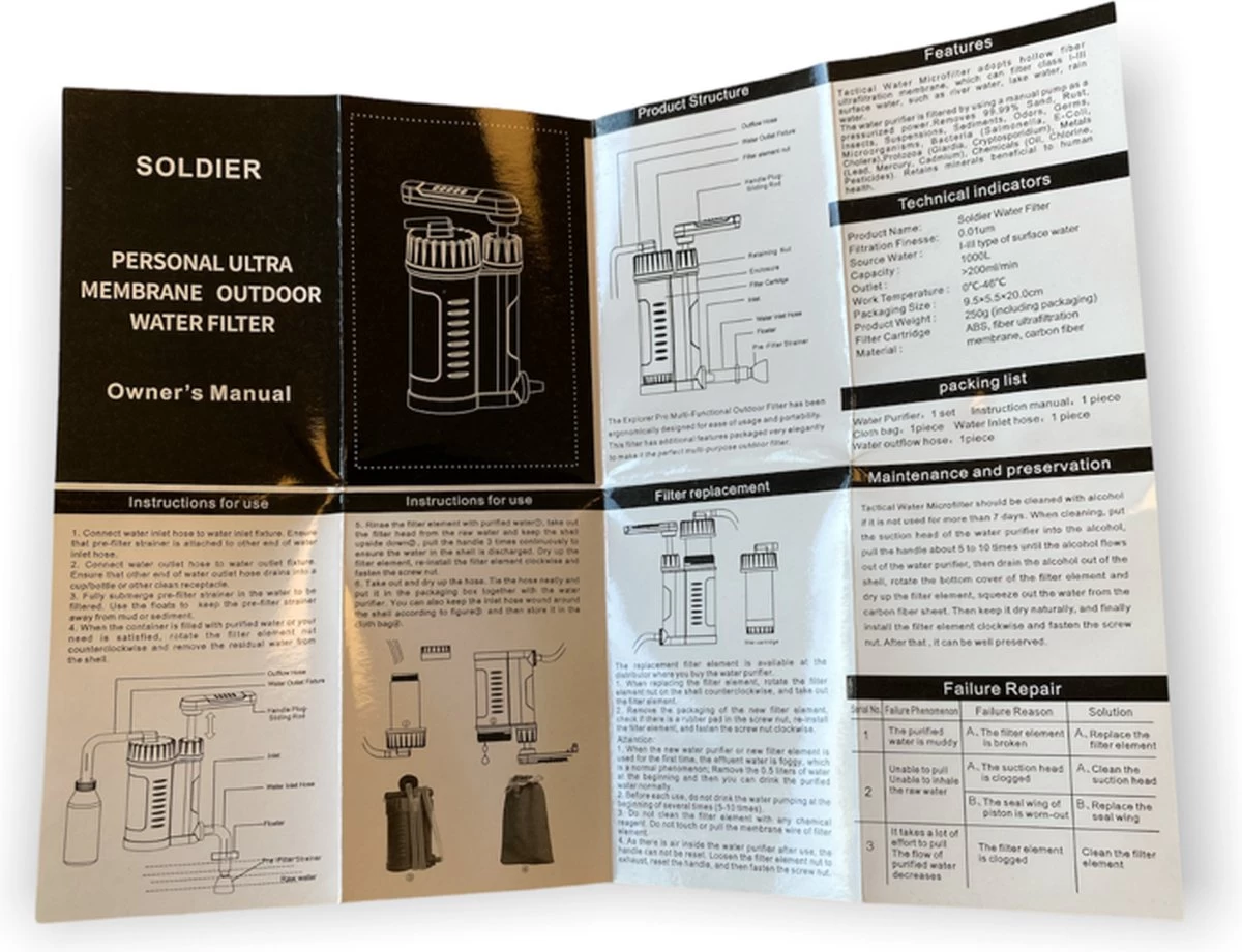 Het hoogwaardige micron hollow-fiber membraan en de antibacteriΓ«le carbon-fiber combinatie van deze filter verwijdert maar liefst 99,99999% van alle bacteriΓ«n, aroma’s, chloor, organisch materiaal en zware metalen. Daarmee behaalt de Filterwell waterfilter een zéér nauwkeurig filterresultaat, waarop je kan vertrouwen! Met deze waterfilter ben je dus verzekerd van voldoende schoon drinkwater op ieder moment. Alles wat je nodig hebt is een waterbron in de natuur!