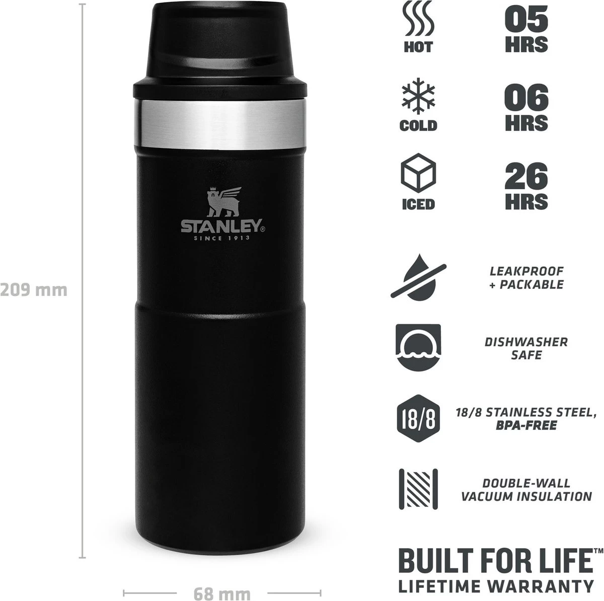 DE PERFECTE REISBEKER: De Stanley Trigger Action Travel Mug is ontworpen om in de meeste bekerhouders te passen, zodat hij gezellig mee kan reizen tijdens het pendelen. De dubbelwandige vacuΓΌmisolatie houdt je favoriete thee, koffie of andere warme dranken 5 uur warm, 6 uur koud en 26 uur ijskoud. De perfecte metgezel voor al je binnen- en buitenshuis avonturen. Kies uit een breed scala aan kleuren en maten.
